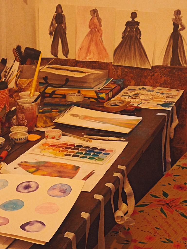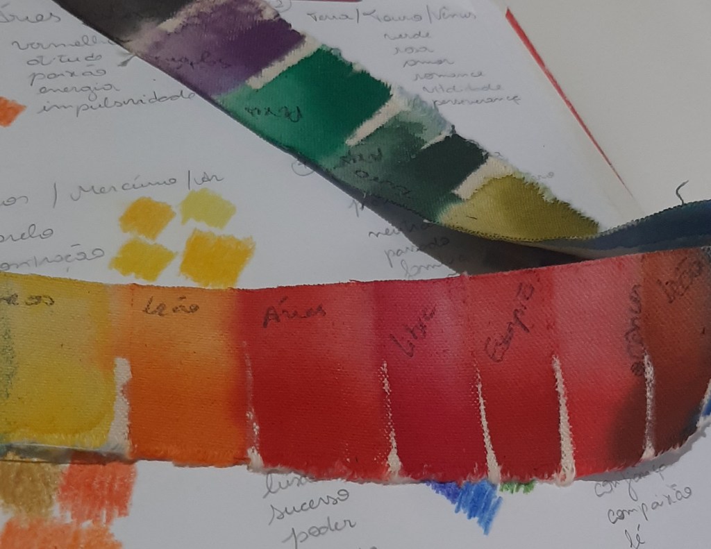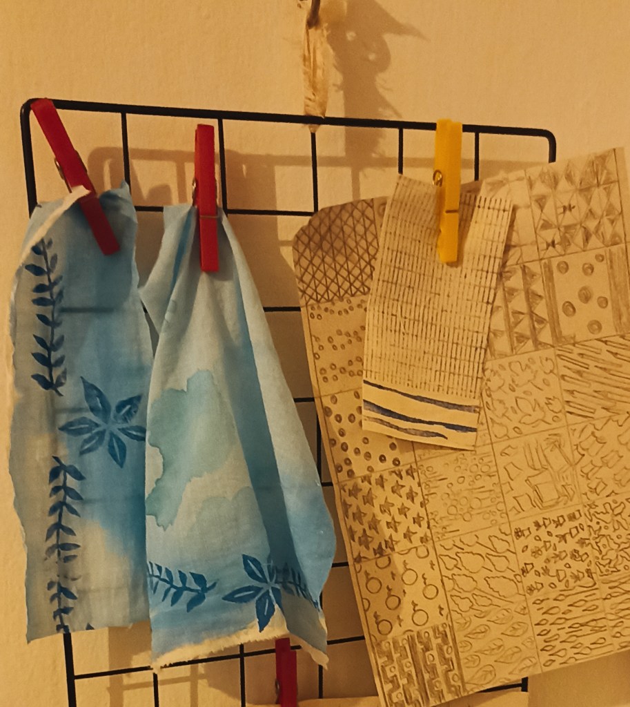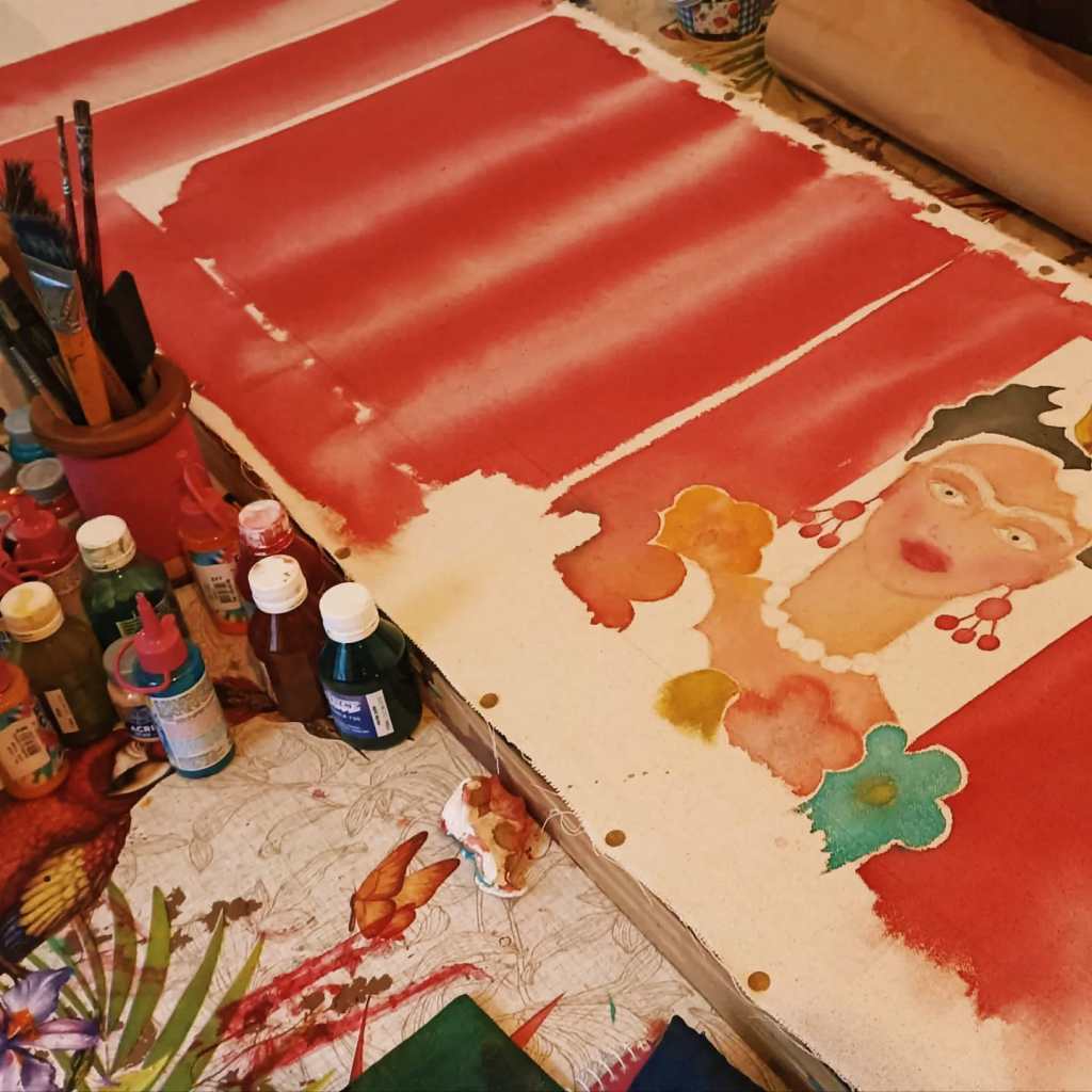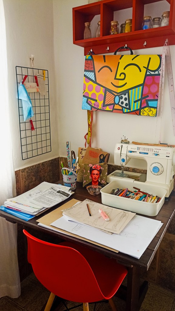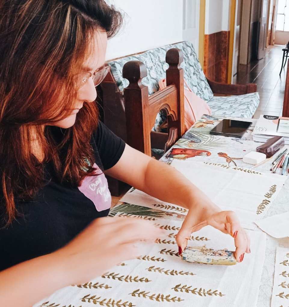 No ateliê, trabalho com processos lentos que amo. Tingimento natural e estamparia manual, através da técnica milenar de blockprinting, do desenho livre no tecido e da aquarela (têxtil e no papel). Aqui faço meus croquis de moda e experimentações. Erros e acertos. Isso alimenta a minha alma, nutre meus dias. Jamais viveria sem essa arte.