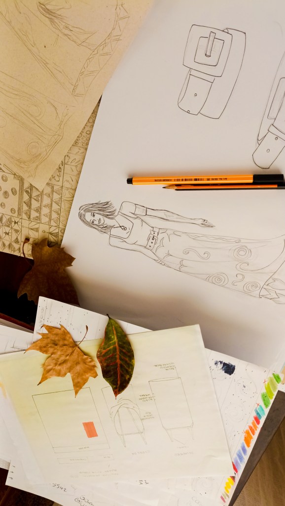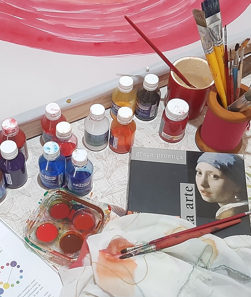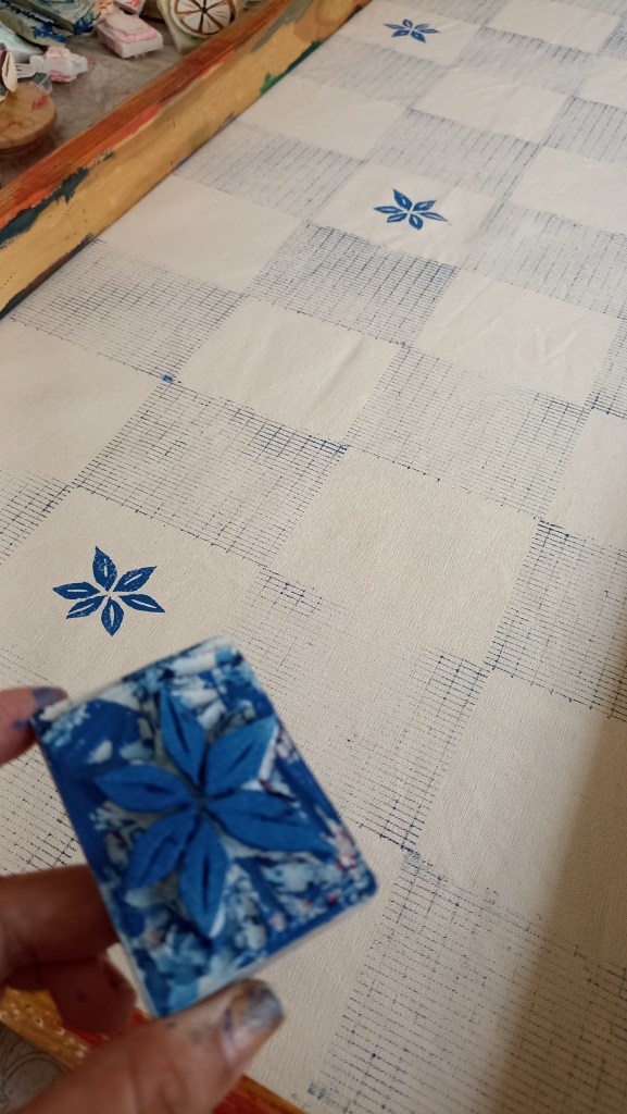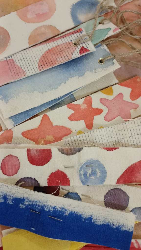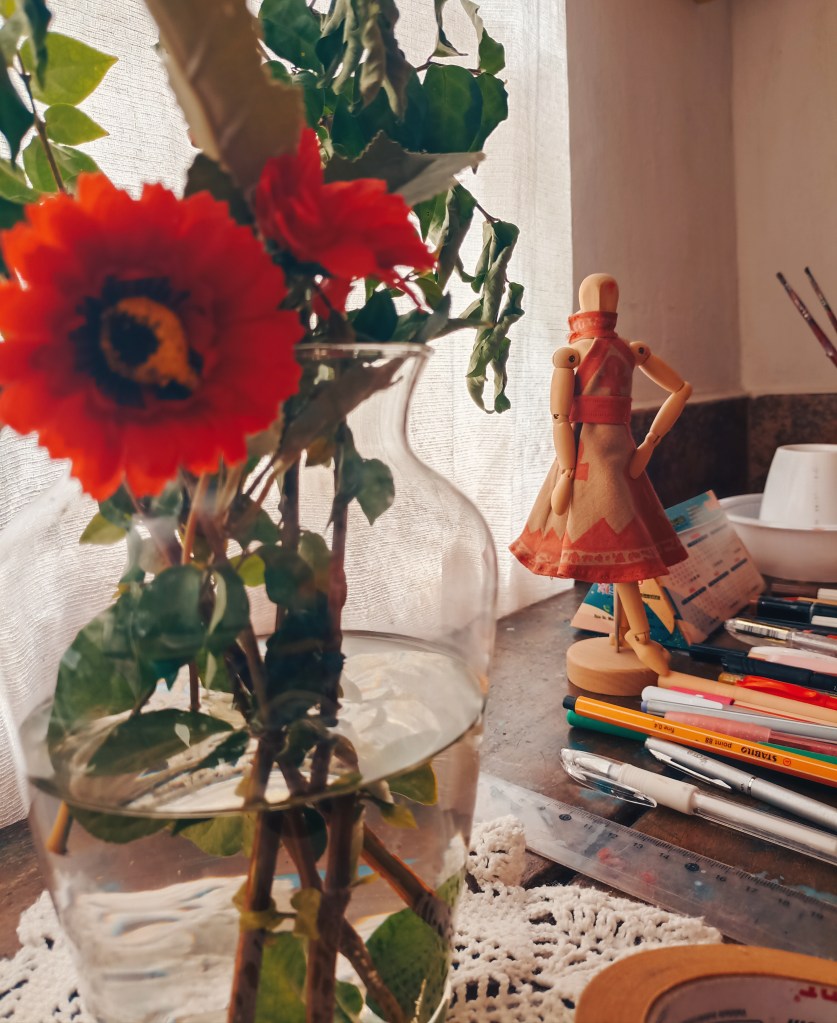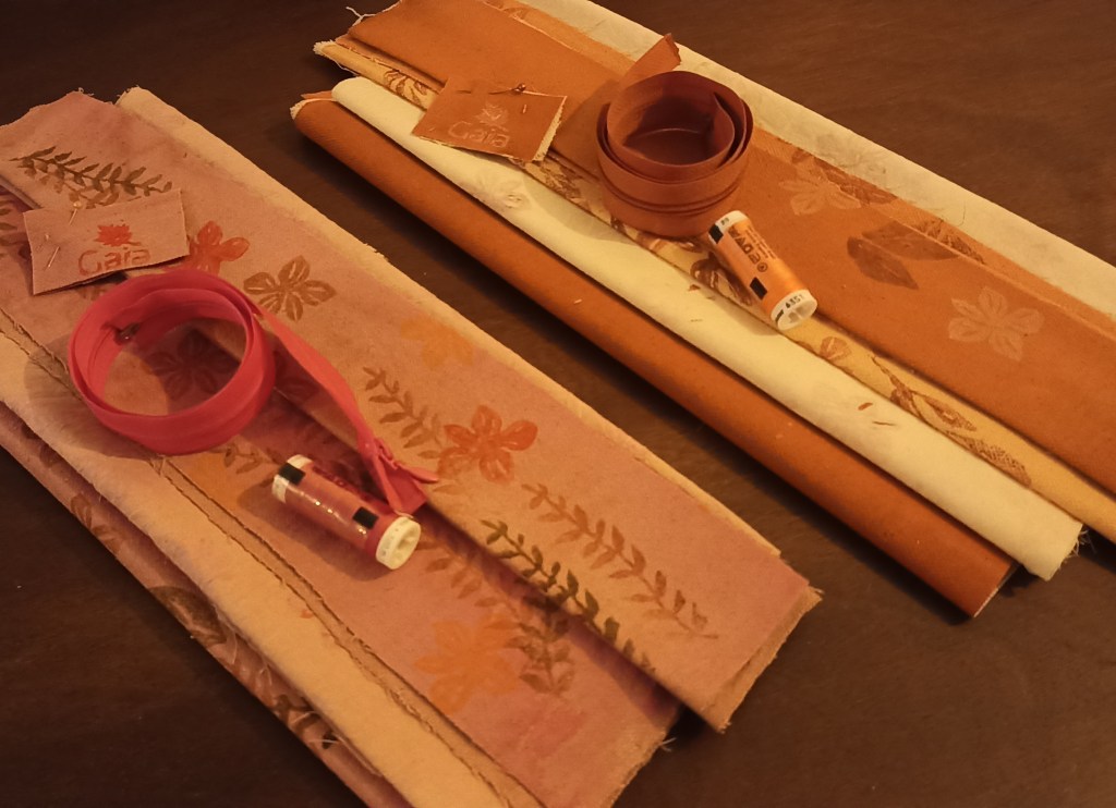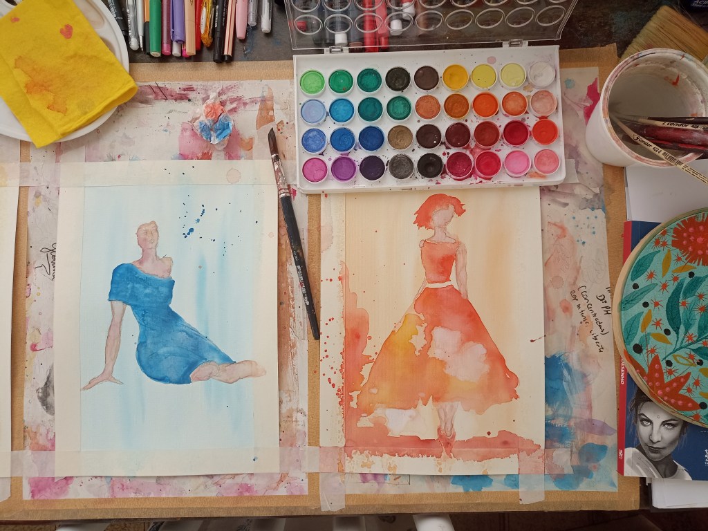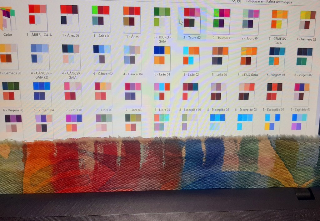 No ateliê, trabalho com processos lentos que amo. Tingimento natural e estamparia manual, através da técnica milenar de blockprinting, do desenho livre no tecido e da aquarela (têxtil e no papel). Aqui faço meus croquis de moda e experimentações. Erros e acertos. Isso alimenta a minha alma, nutre meus dias. Jamais viveria sem essa arte.