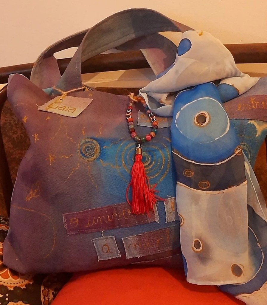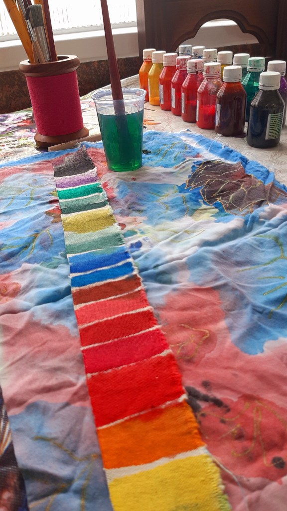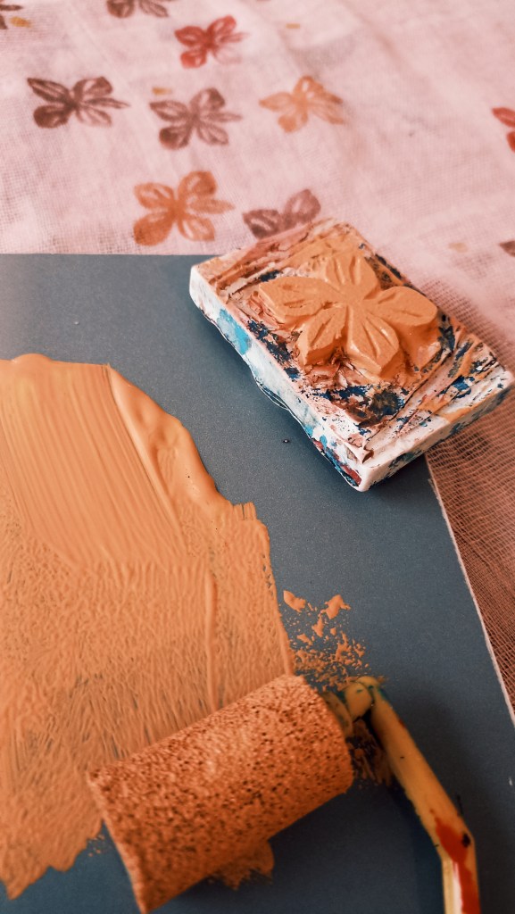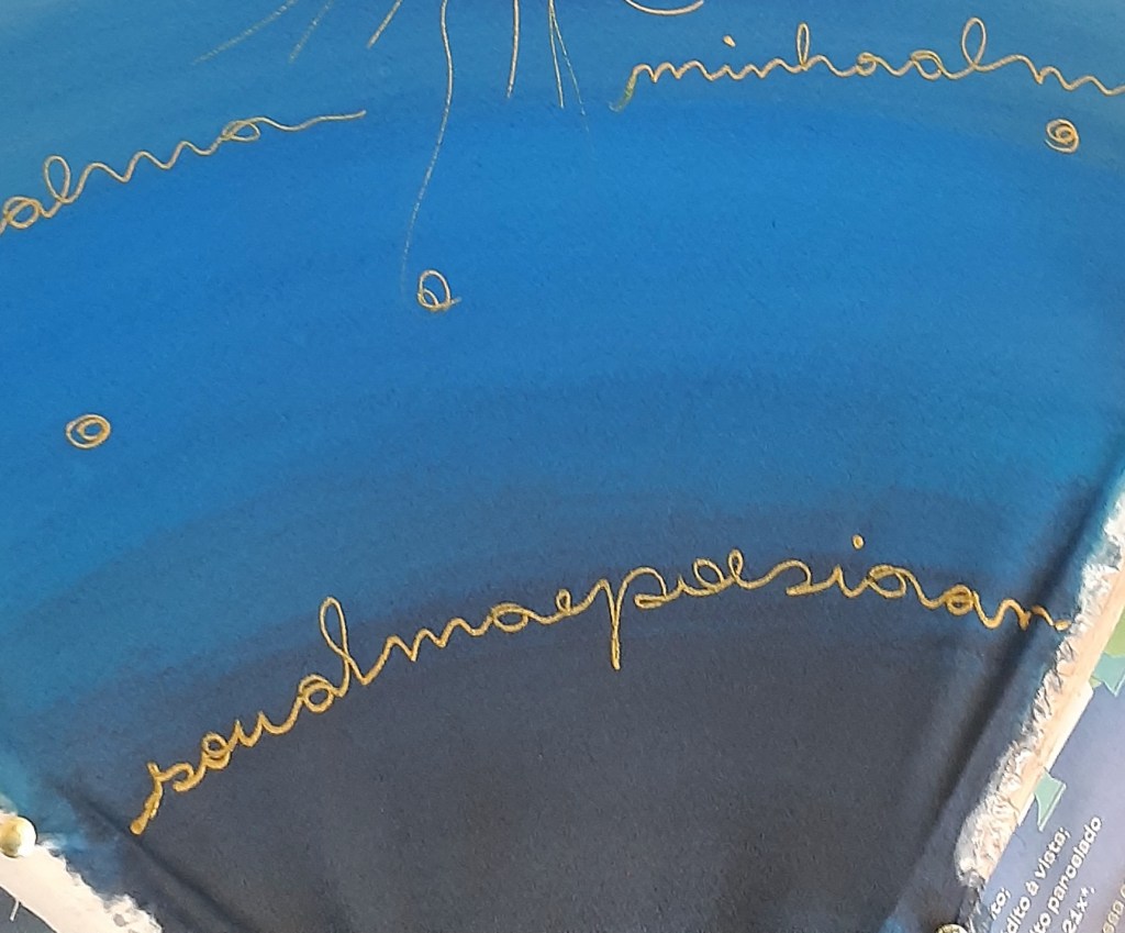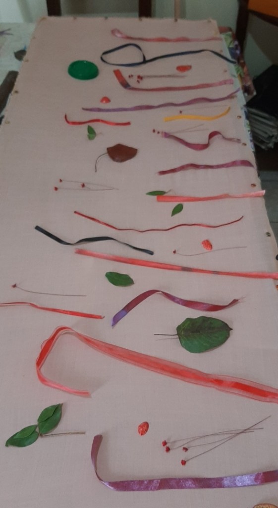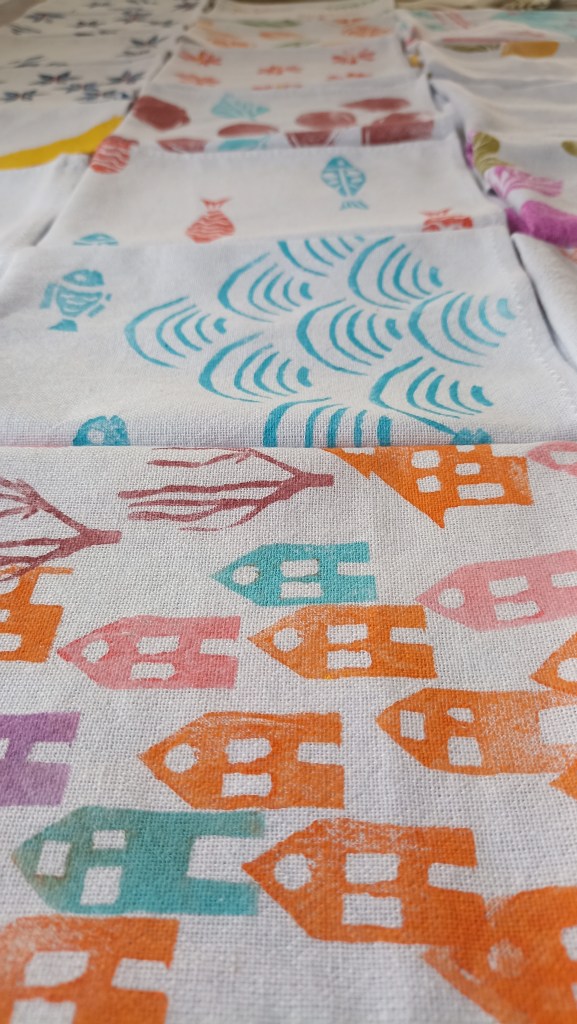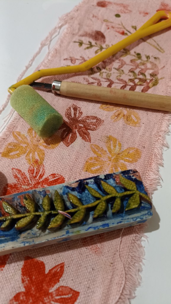 No ateliê, trabalho com processos lentos que amo. Tingimento natural e estamparia manual, através da técnica milenar de blockprinting, do desenho livre no tecido e da aquarela (têxtil e no papel). Aqui faço meus croquis de moda e experimentações. Erros e acertos. Isso alimenta a minha alma, nutre meus dias. Jamais viveria sem essa arte.
