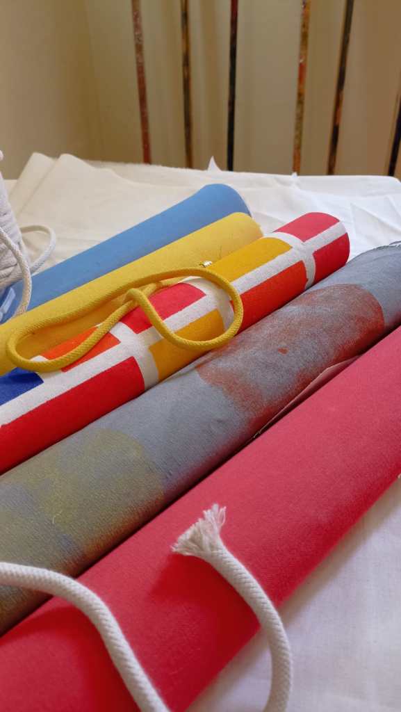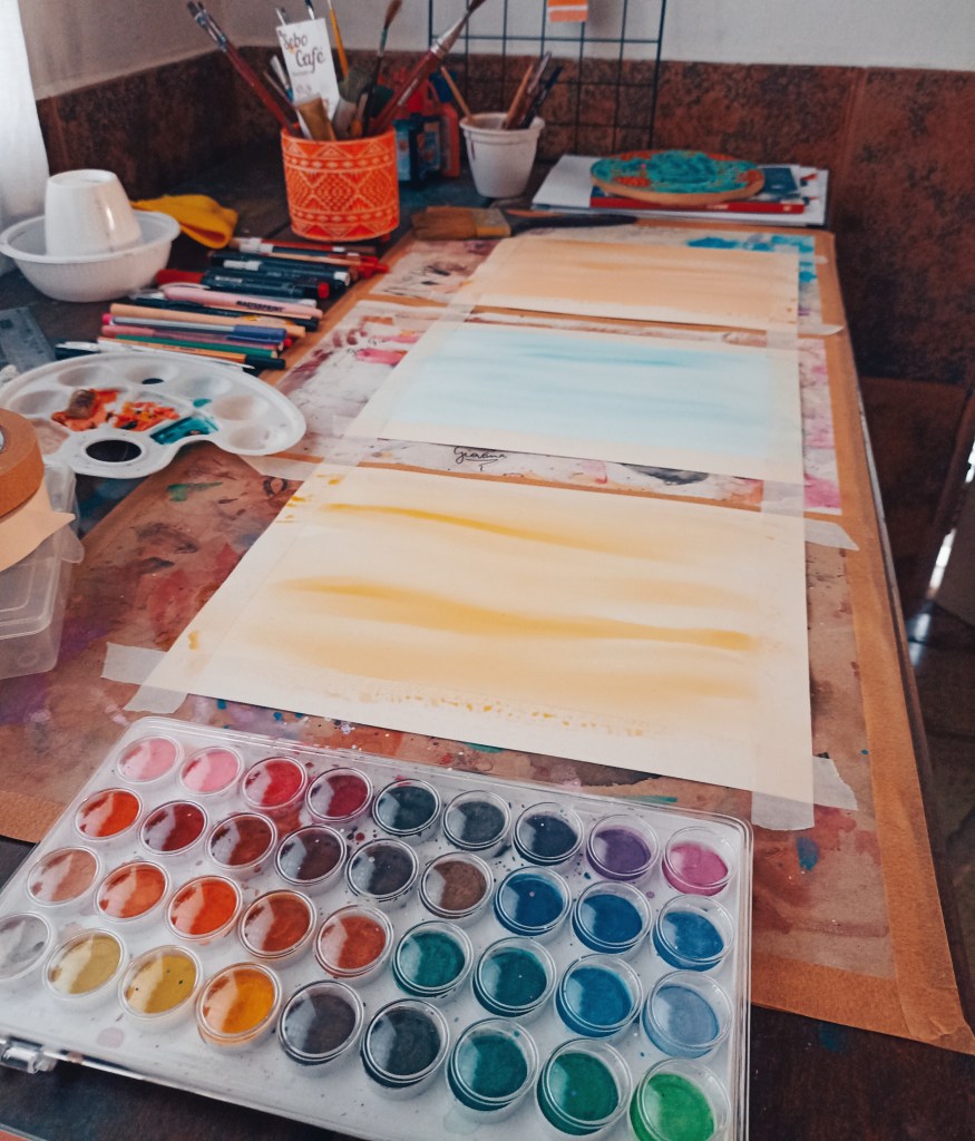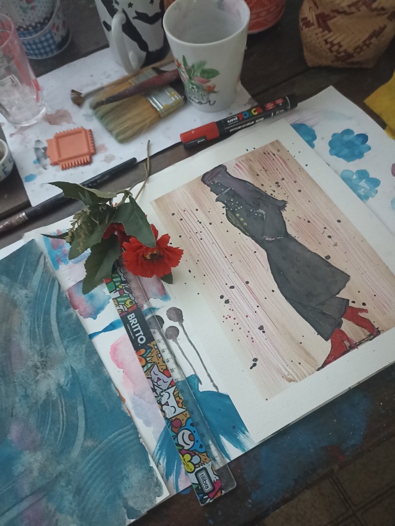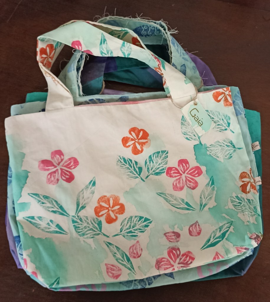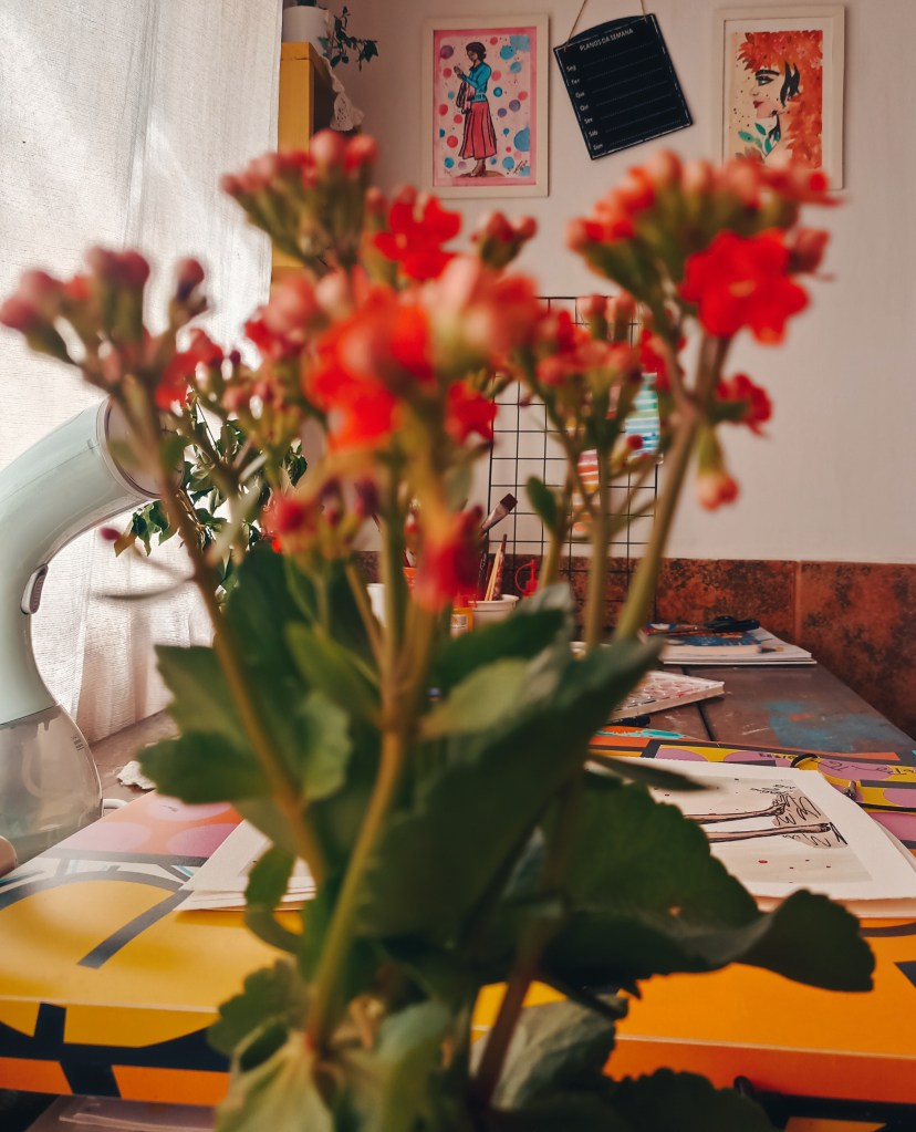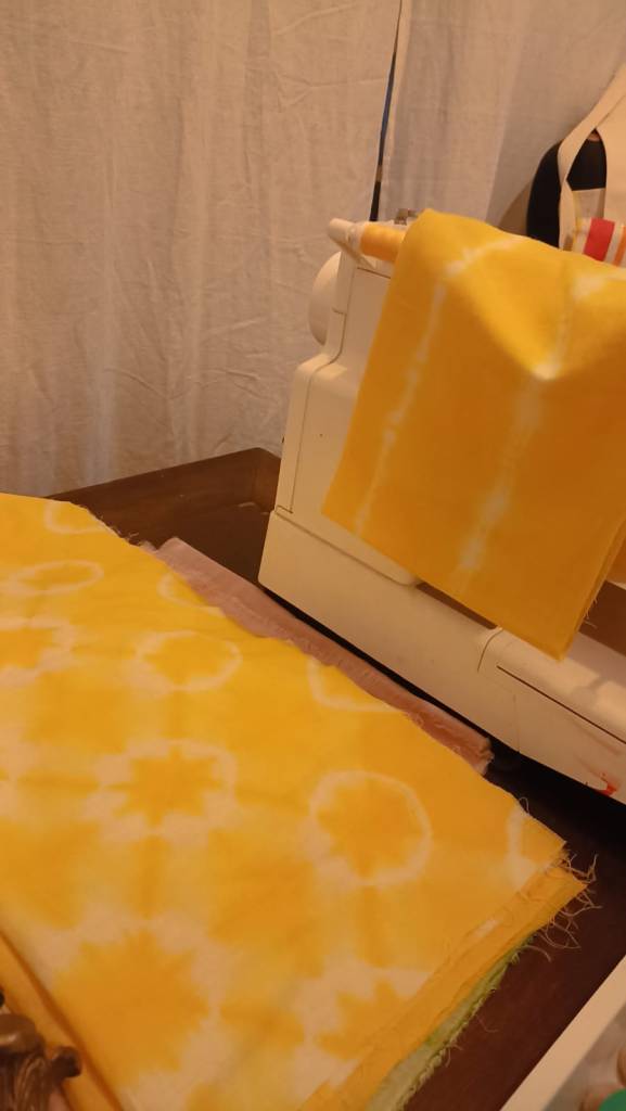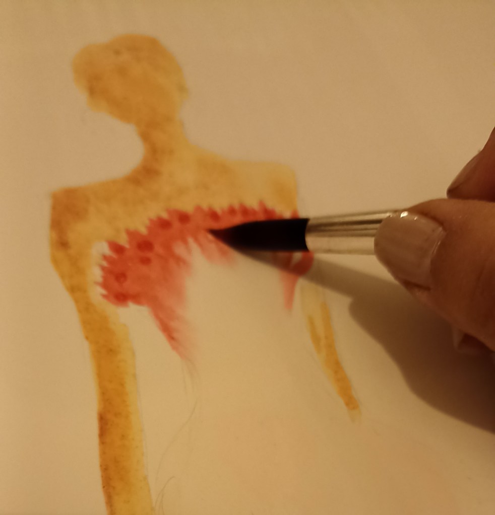 No ateliê, trabalho com processos lentos que amo. Tingimento natural e estamparia manual, através da técnica milenar de blockprinting, do desenho livre no tecido e da aquarela (têxtil e no papel). Aqui faço meus croquis de moda e experimentações. Erros e acertos. Isso alimenta a minha alma, nutre meus dias. Jamais viveria sem essa arte.